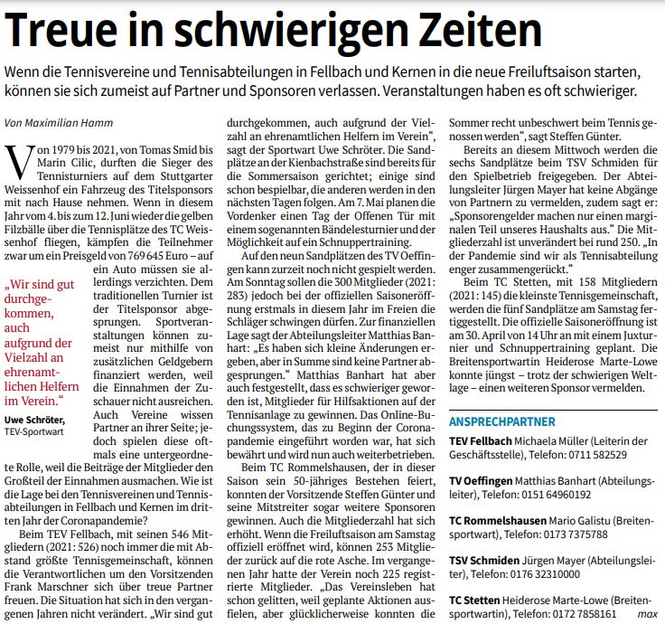 Bericht der Fellbacher Zeitung "Treue in schwierigen Zeiten". Erschienen am Mittwoch, den 21.04.2022, im Lokalsport auf Seite IV der Fellbacher Zeitung.