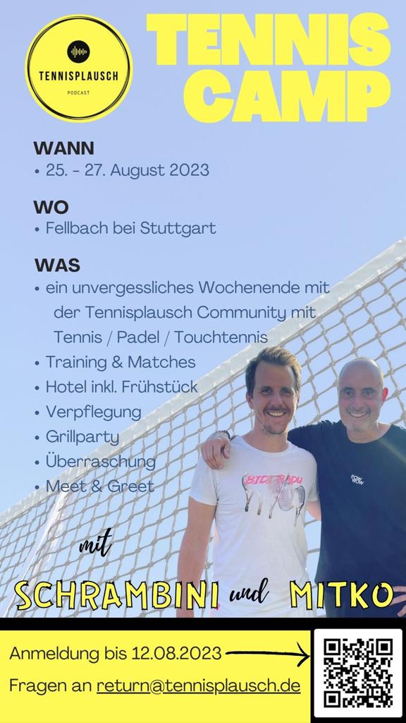 Die deutschlandweite Tennisplausch Community zu Gast in Schmiden. Erstmals veranstalten Mitko und Schrambini ein gemeinsames Tenniscamp, das von Freitag bis Sonntag auf unserer Tennisanlage stattfindet. Wir freuen uns auf actionreiche Tage und jede Menge Spaß.